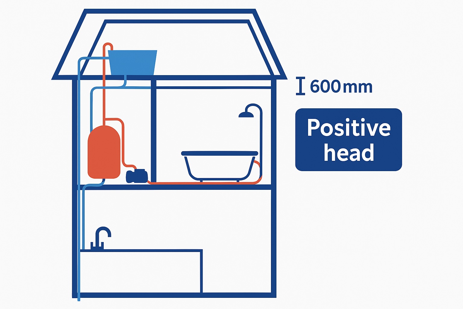 This diagram shows a typical gravity-fed setup. If the vertical distance between your tank and shower is too small (under 600mm), pressure may be poor.
